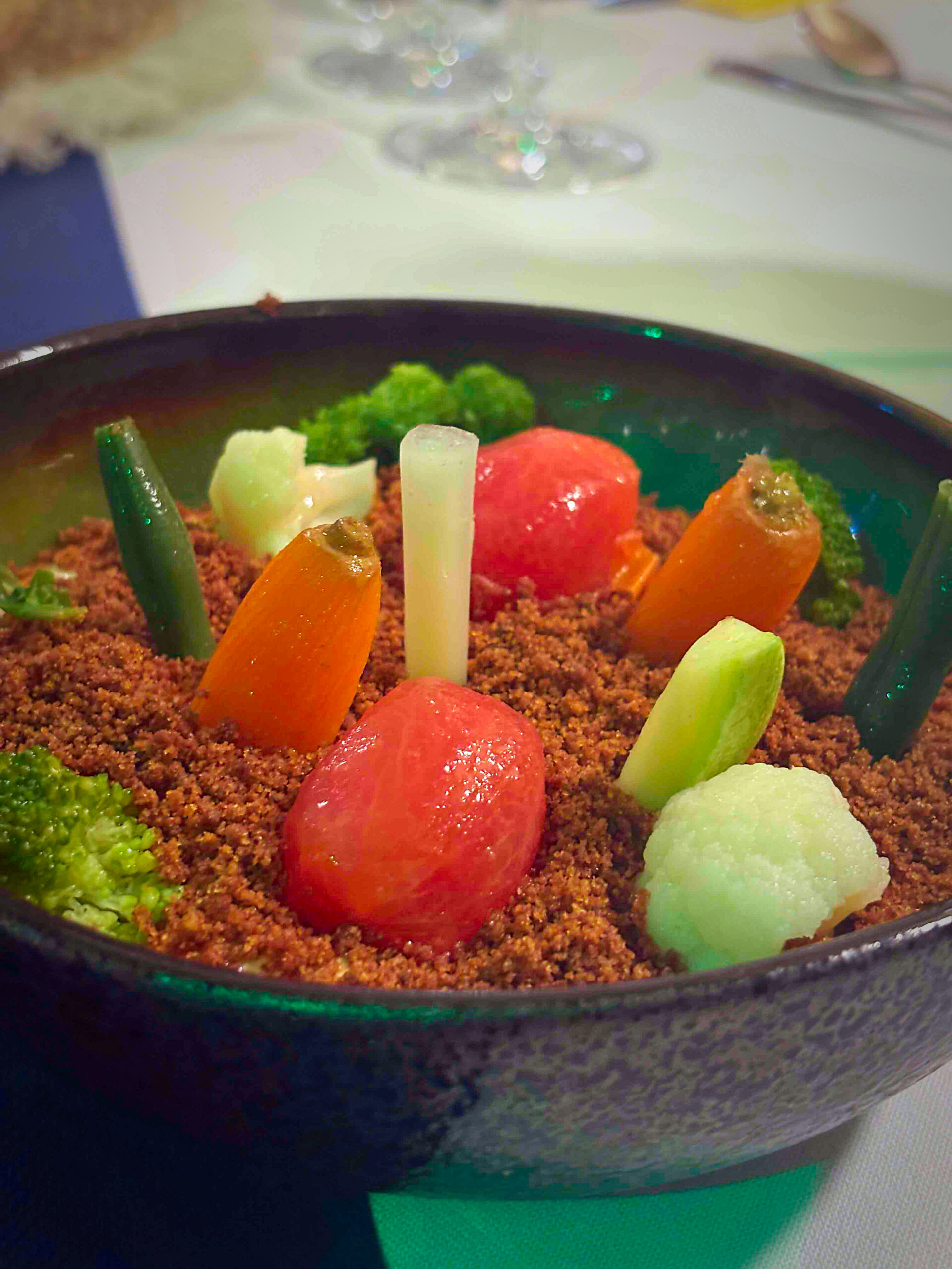 Marín sirvió una suerte de aperitivos que arrancaron con el mítico Huerto -en su versión Chiringuito Tropical- finísimas cremas de base -apionabo, coliflor, tártara-, crujiente crumble y la plantación de verduritas impecables de punto. Su carta de presentación, rotunda. Un listón alto en la salida que el chef fue replicando en todos los pases con la soltura que da el disfrute y la solidez de tres décadas dirigiendo servicios.